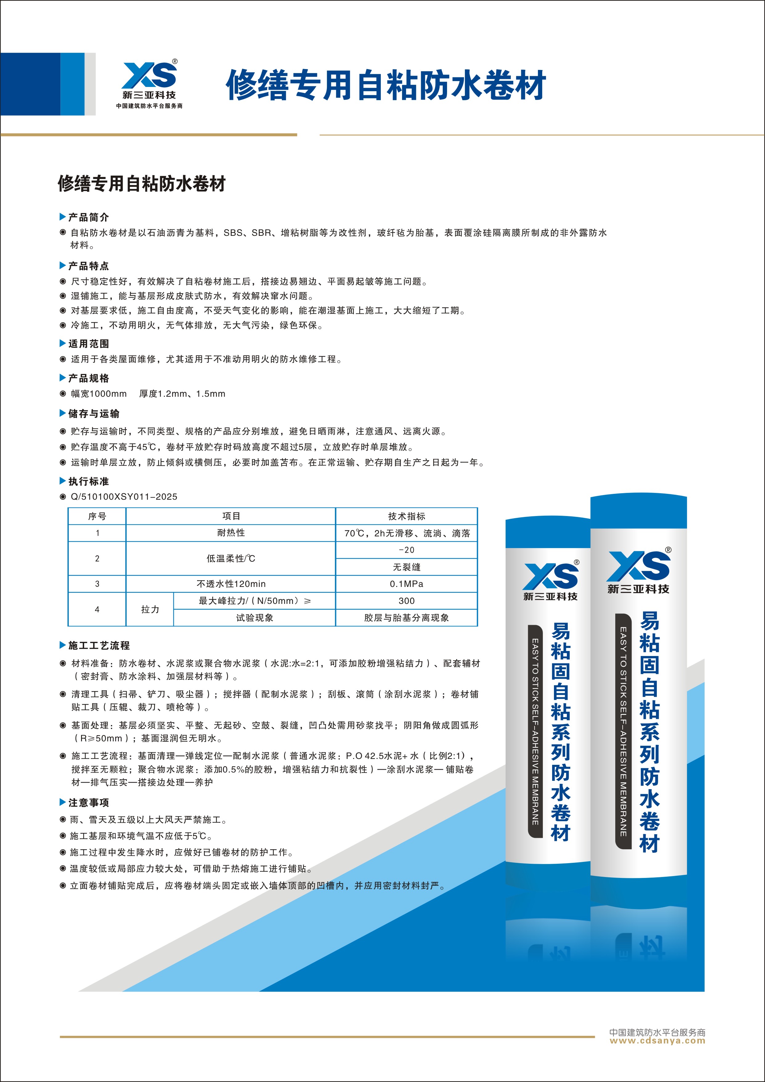 修繕專用自粘防水卷材是以石油瀝青為基料,SBS、SBR、增粘樹脂等為改性劑,玻纖氈為胎基,表面覆涂硅隔離膜所制成的非外露防水材料。