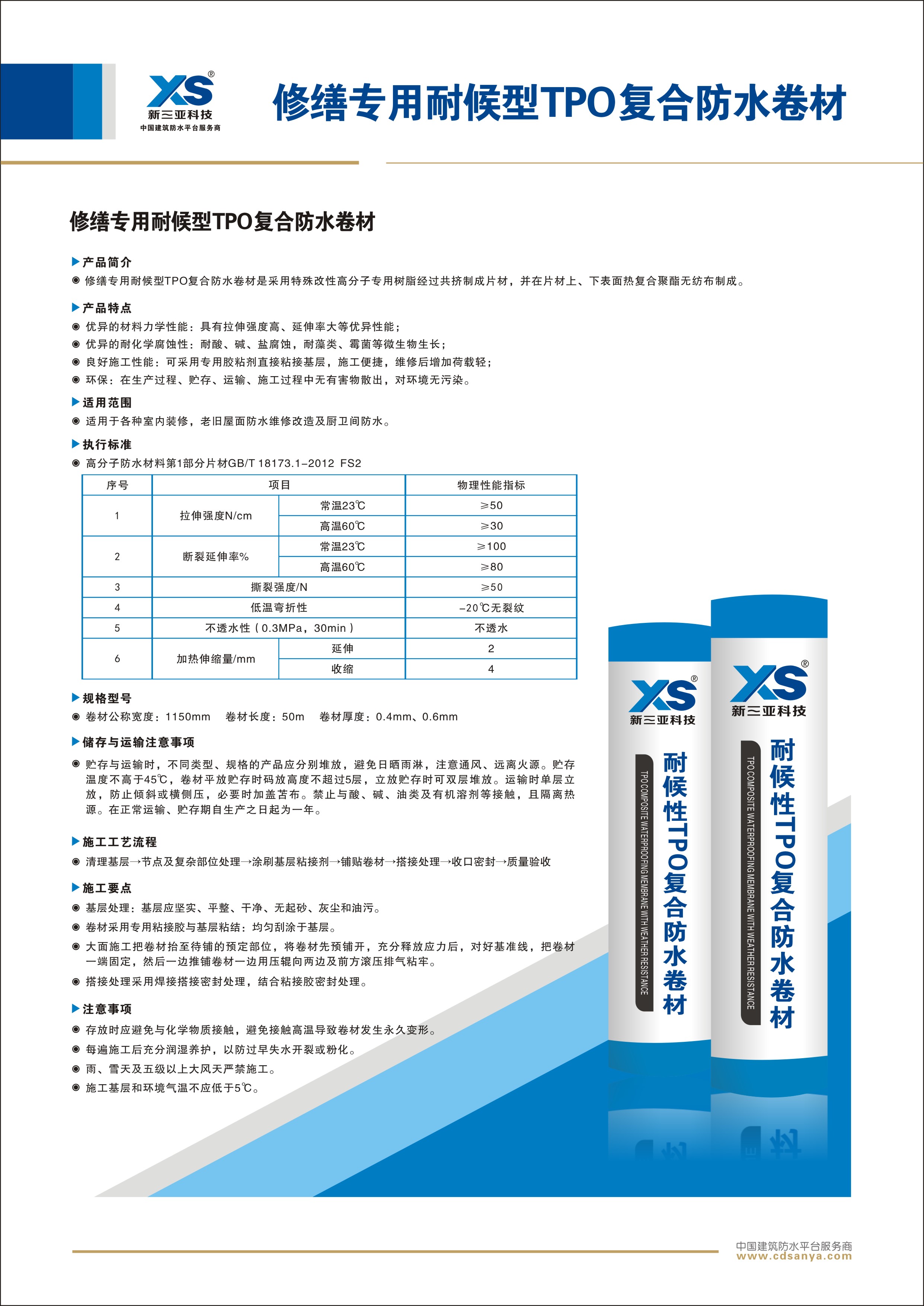 產(chǎn)品簡(jiǎn)介: 修繕專(zhuān)用耐候型TPO復(fù)合防水卷材是采用特殊改性高分子專(zhuān)用樹(shù)脂經(jīng)過(guò)共擠制成片材,并在片材上、下表面熱復(fù)合聚酯無(wú)紡布制成。 規(guī)格:FS2-TPO-50.0m×1.15m×0.6mm | ![]() |