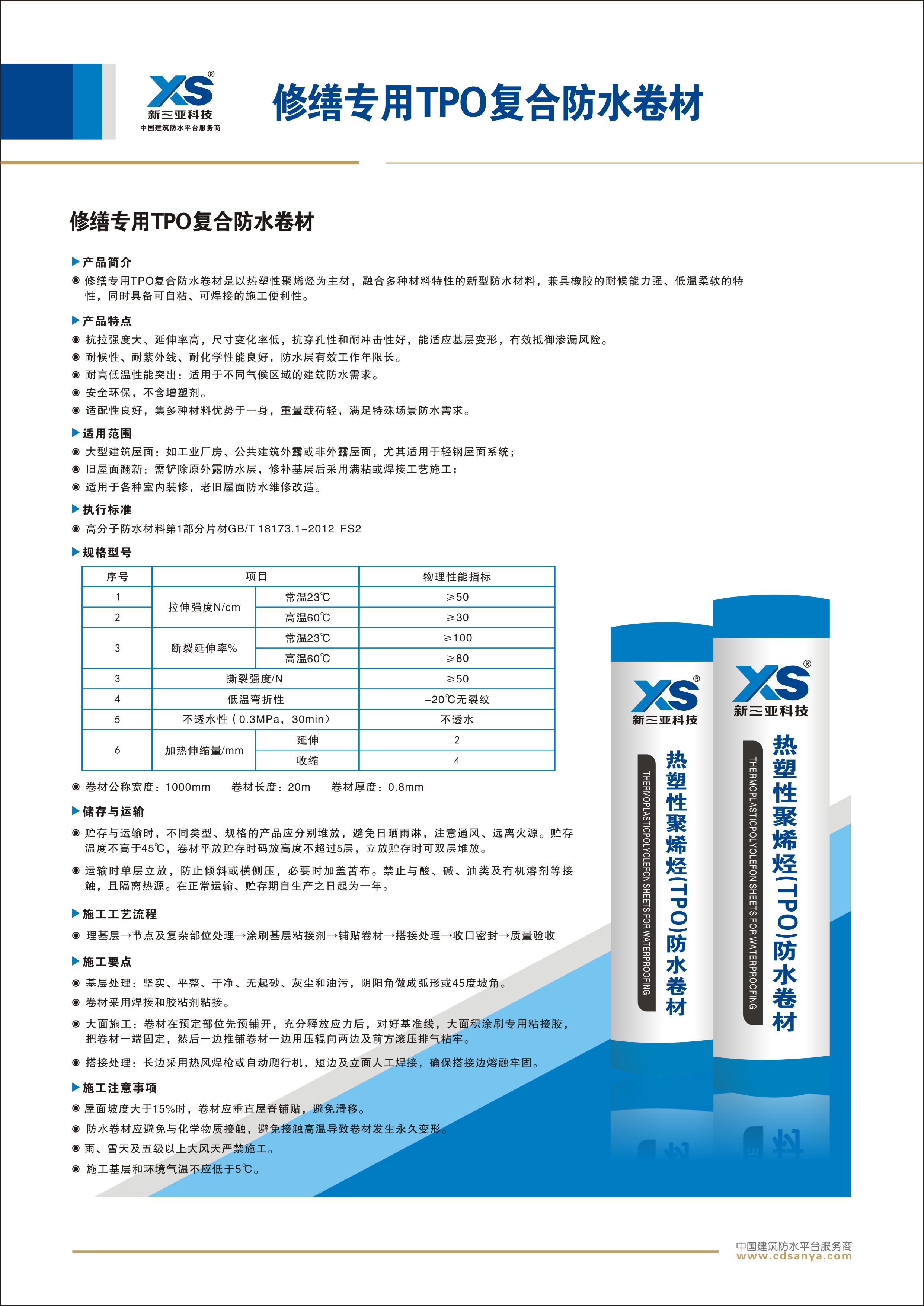 產(chǎn)品簡介: 修繕專用TPO復(fù)合防水卷材是以熱塑性聚烯烴為主材,融合多種材料特性的新型防水材料,兼具橡膠的耐候能力強(qiáng)、低溫柔軟的特性,同時(shí)具備可自粘、可焊接的施工便利性。 規(guī)格:FS2-TPO-20.0m×1.15m×0.8mm | ![]() |